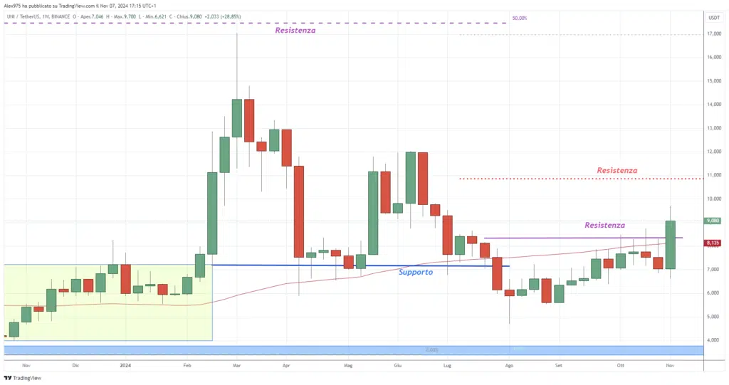 ll rialzo settimanale di Uniswap si attesta al 27,55% e, al prezzo attuale, quota 8,899 USDT. Questo aumento porta in verde anche l’andamento su base mensile, che si attesta a +17,50%, e spinge il rialzo da inizio 2024 a +25%.