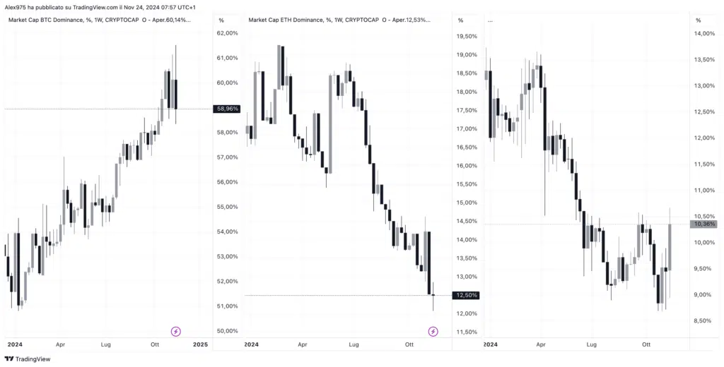 L’attuale rialzo ha riportato la dominance di Bitcoin oltre il 60%, livelli che non si vedevano da marzo 2021. Tuttavia, nell’ultima settimana, si è registrata una reazione da parte della dominance di Ethereum e delle altcoin, che hanno mostrato significativi rialzi. Anche con Bitcoin che continua a segnare nuovi ATH, i rialzi delle altcoin appaiono molto consistenti.