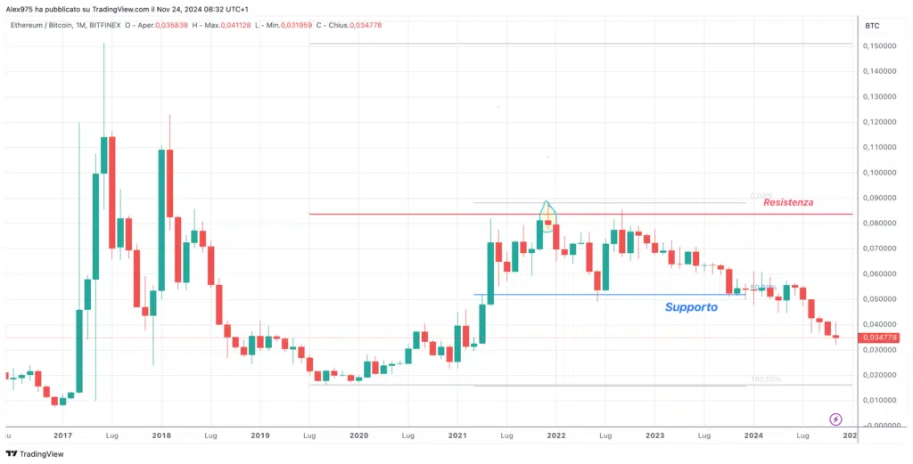 Sul grafico monthly allegato abbiamo una panoramica storica del rapporto ETHBTC. Qui si può notare come, nei primi anni, il rapporto abbia mostrato movimenti erratici molto forti tra il 2017 e il 2018. Successivamente, la volatilità ha iniziato a calare, contribuendo a un miglior utilizzo di questo modello di analisi.