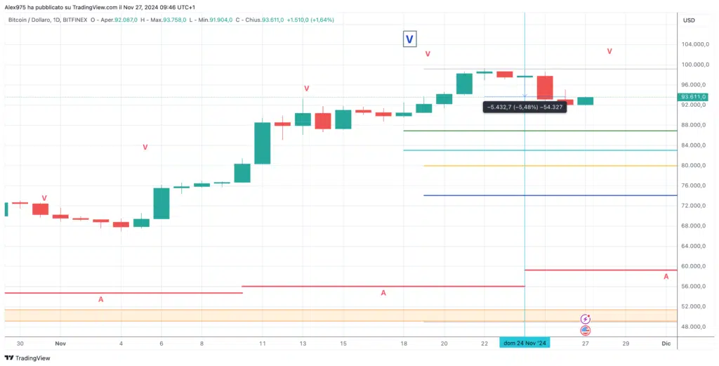 In allegato riportiamo un grafico daily di Bitcoin, focalizzato sul vettore di novembre, che va dal minimo a 66.880$ fino al massimo a 99.334$. La discesa iniziata domenica ha portato ieri a un minimo di 90.911 dollari. Attualmente, BTC quota 93.600$, in ritracciamento di poco meno del 5,48% dal suo ATH.
