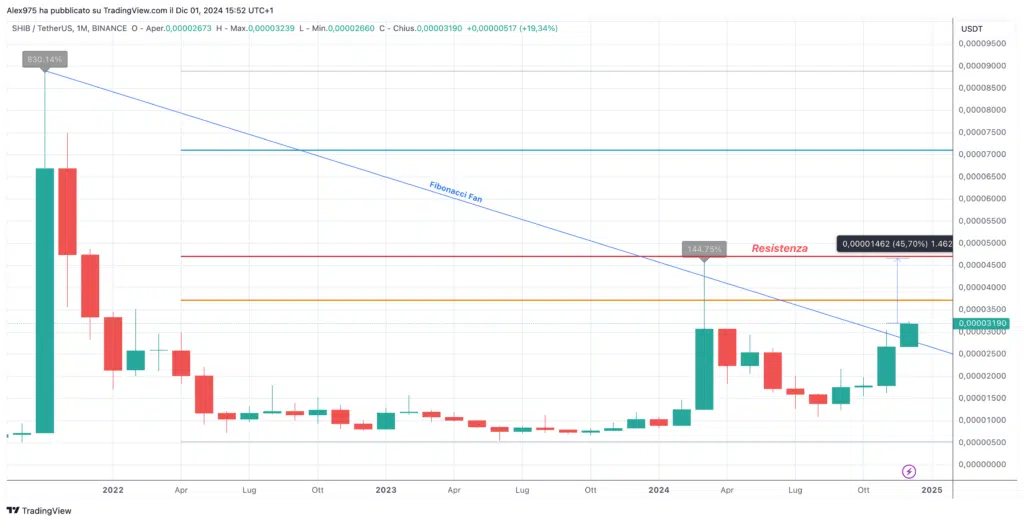 Il rialzo di dicembre 2024 di Shiba è già del 20%e nel grafico monthly allegato abbiamo una panoramica di lungo periodo in cui si può osservare il suo ATH a 0,00008854 USDT registrato in ottobre 2021. Da questo massimo storico è iniziata la fase di calo del prezzo che è entrato rapidamente in un bearish trend primario. Nella fase ribassista SHIB nel giugno 2023, ha raggiunto il minimo di periodo al prezzo di 0,00000543 USDT.