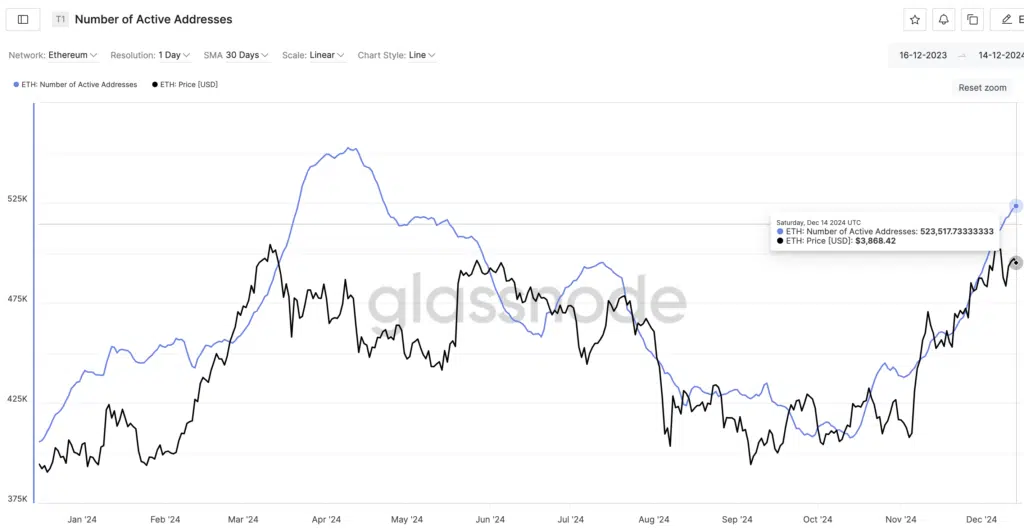 In questi scenari, è sempre importante osservare cosa fanno le Whales, le mani forti di Ethereum. Osservando la metrica “Ethereum: Whale Address Count [Balance >1k ETH]”, nel corso del 2024 le whales hanno seguito una fase di accumulo. Questo accumulo è iniziato durante il ribasso di agosto, quando Ethereum ha toccato un minimo in area 2.350$.