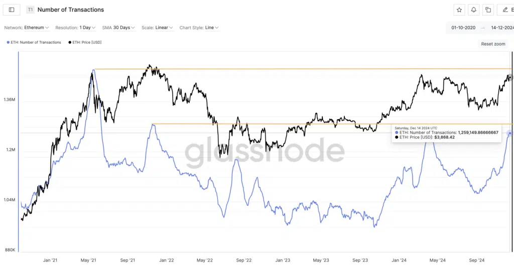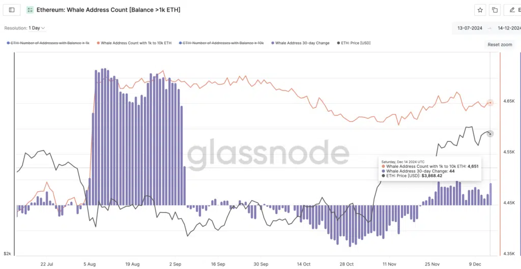 Nei mesi successivi, c’è stato un leggero calo con andamento in swing e una ripresa a novembre, in coincidenza con l’elezione di Trump alla Casa Bianca. Il picco di periodo è stato toccato a fine novembre, ma con il ritorno di ETH sopra i 4.000$, non ci sono state rilevanti vendite da parte delle whales.