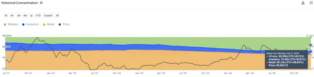 Questa tendenza del comportamento delle whales si può cogliere ancora meglio osservando un grafico di lungo periodo dall’ATH di Ethereum del novembre 2021. Tramite la metrica del sito IntoTheBlock “Historical Concentration”, si può vedere la costante crescita negli anni, evidenziata dall’area verde. Allo stato attuale, le whales detengono il 43,50% della supply circolante di Ethereum.