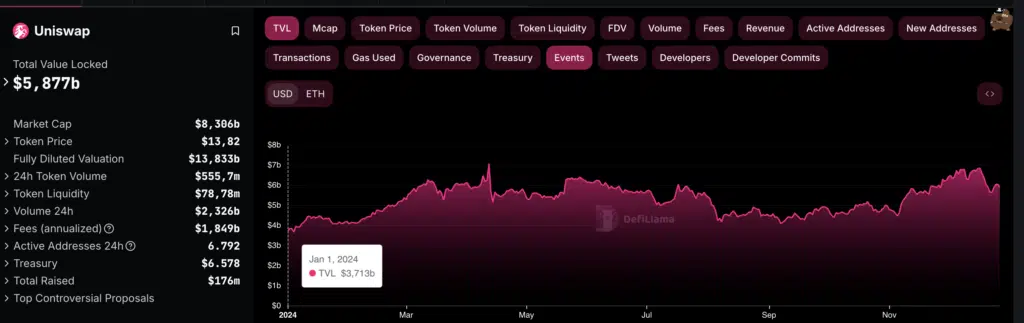 Uniswap non cresce solo grazie a fattori esterni, ma anche grazie a un’importante evoluzione del suo ecosistema. Infatti, si conferma il DEX (Decentralized Exchange) di riferimento della DeFi, con un Total Value Locked (TVL) di circa 6 miliardi di dollari, registrando un incremento del +62% da inizio anno, come riportano i dati di DefiLlama.