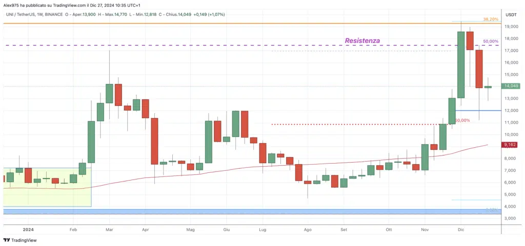 Il ribasso è proseguito e a luglio, il prezzo ha toccato un minimo di 4,703 USDT , per poi riprendersi con un tentativo di rimbalzo ad agosto. A novembre, sul boom dell’elezione di Trump, il prezzo di UNI ha raggiunto un massimo di 19,47 USDT, fermandosi sulla resistenza di lungo periodo tra 17,50 e 19,30 USDT. Il livello di 19,30 USDT corrispondente al 38,2% di Fibonacci del vettore storico che va dall’ATH fino al minimo a 3,30 USDT.