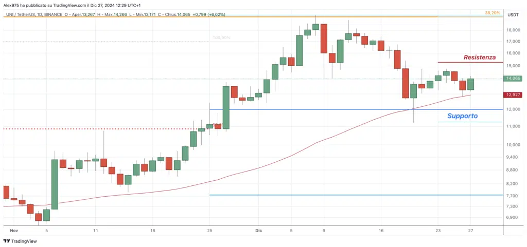 Attualmente, Uniswap quota 13,655 USDT e, a dicembre, è ancora in rialzo del +6,50%, nonostante il ritracciamento dal massimo mensile e annuale di 19,47 USDT. Questo rappresenta una contrazione del -29%, ma il trend da inizio anno rimane ampiamente positivo, con un +90%.
