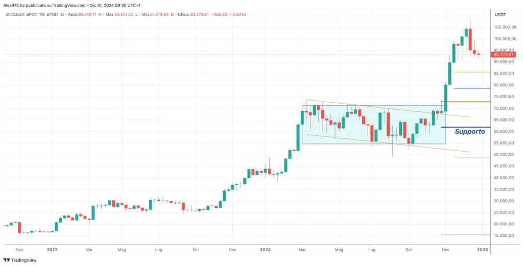 Venendo alla situazione attuale, l’ingresso nel 2025 di Bitcoin appare un po’ incerto e con qualche nube all’orizzonte. Osservando il grafico monthly, si può notare che l’attuale candela in formazione sta lasciando una lunga shadow superiore. Infatti, rispetto all’ATH, il prezzo è in calo del 14,30%.