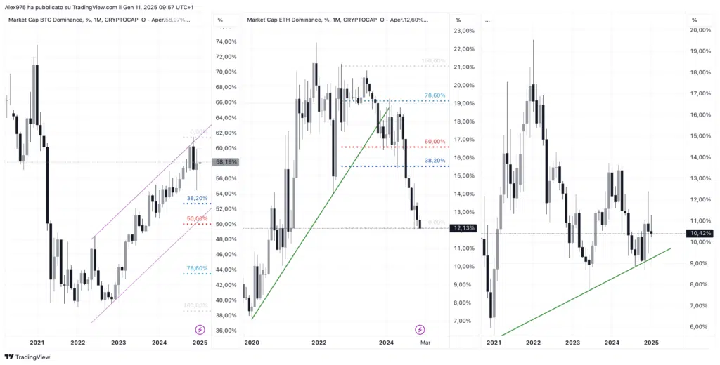 Il primo punto che si osserva è quello dato dalla dominance. Il confronto tra la dominance di BTC, ETH e le OTHERS è il primo passaggio che coinvolge analisti e trader. Nel grafico allegato riportiamo la comparativa, che contribuisce a una prima valutazione visiva del loro andamento.