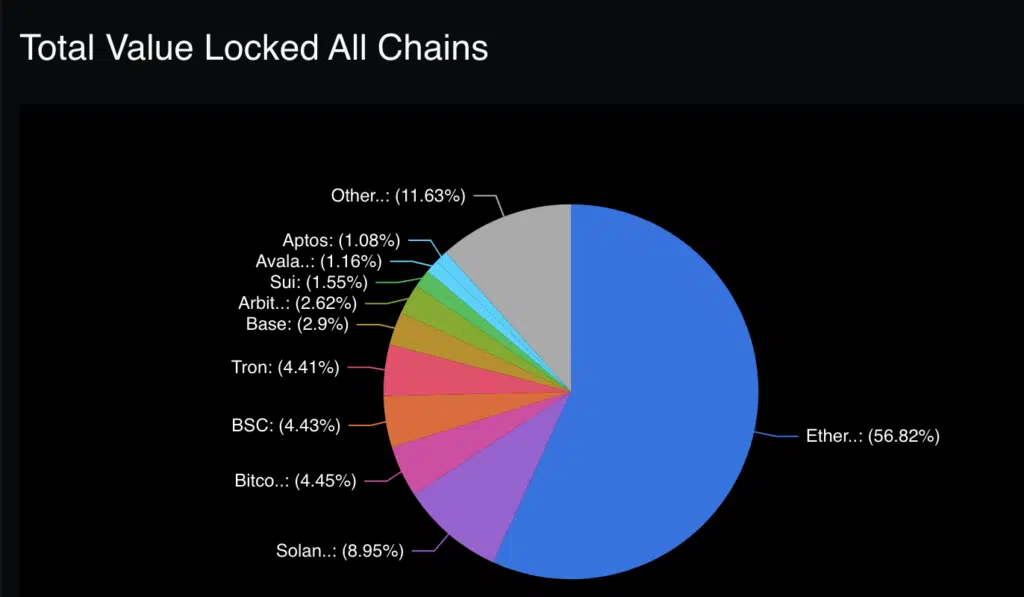 La blockchain di Ethereum rimane il leader del settore DeFi, con una TVL (Total Value Locked) di 90,10 miliardi di dollari. La sua dominance sul settore si attesta attualmente al 56,25% della TVL totale.