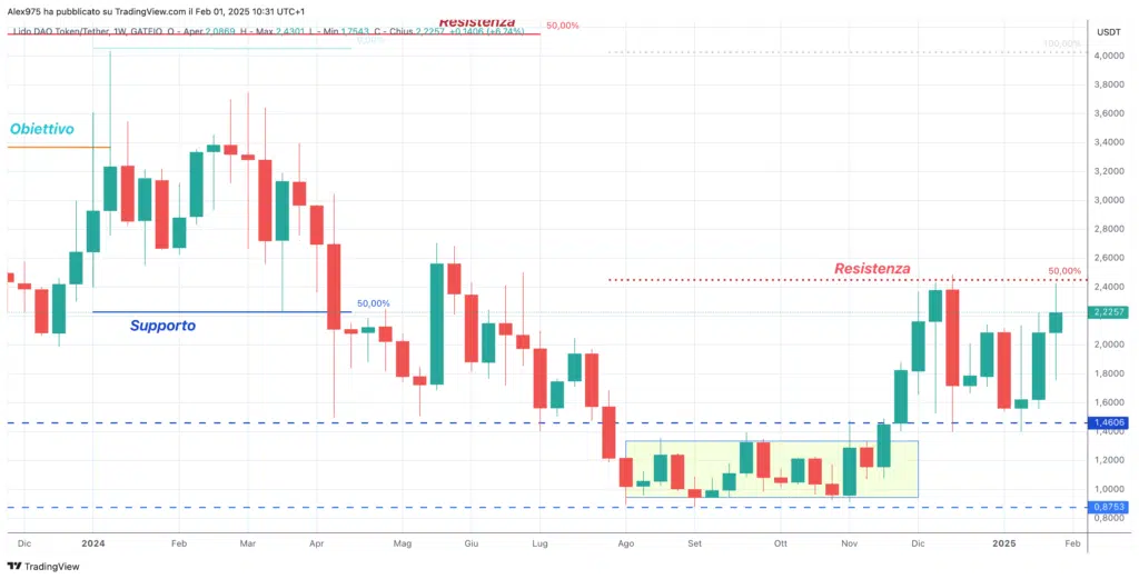 Sul grafico weekly, abbiamo una panoramica dell’andamento del prezzo di Lido DAO dall’inizio del 2024, dove si nota chiaramente la fase di calo che ha caratterizzato l’intero anno, intervallata da una serie di swing ribassisti e rialzisti.