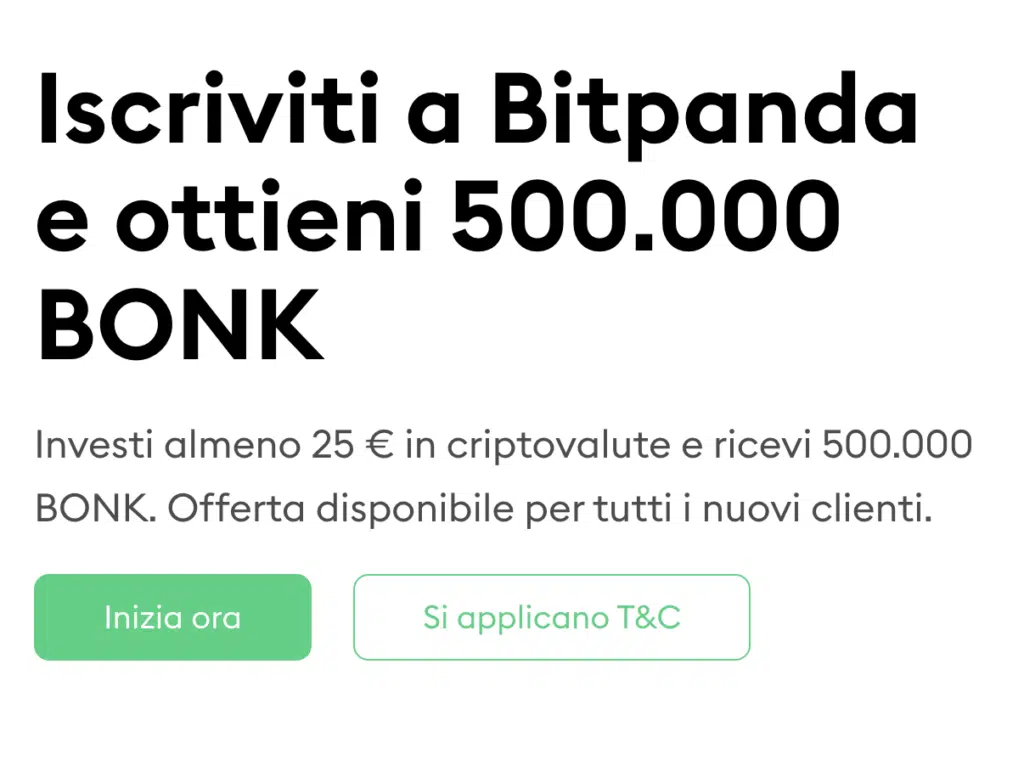 Solo per i lettori di Criptovaluta.it, il broker crypto Bitpanda mette a disposizione una PROMOZIONE ESCLUSIVA che ti permetterà di riscuotere facilmente ben 500.000 $BONK, una delle crypto meme più forti di questo ciclo. Per ricevere i 500.000 $BONK gratis non dovrai fare nulla, se non iscriverti e fare un modesto investimento di 25€, che rimarranno comunque tuoi.