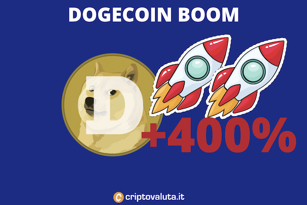 La criptovaluta Dogecoin è la vera regina ultime ore di contrattazione, decuplicando i guadagni che avevamo già visto – in una news recente su Bitcoin. Se il re delle criptovalute continua ad avvicinarsi a quota 40.000$, quanto avvenuto a DogeCoin ha ancora di più dell’incredibile. Il prezzo, tenendo conto solo delle ultime 24 ore, salito di più del 400%.