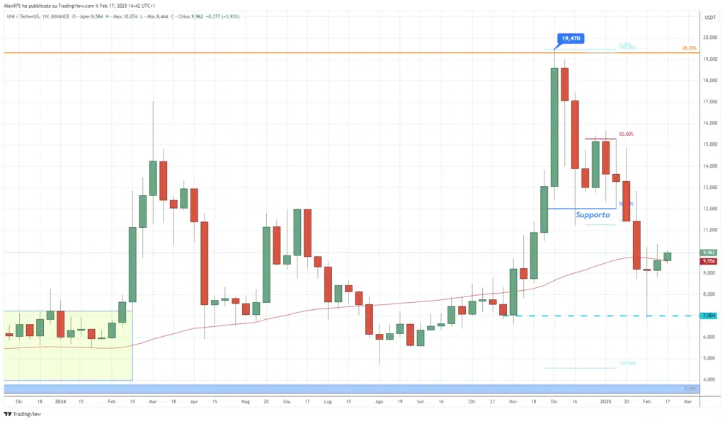 Analizzando l’andamento del prezzo di $UNI sul grafico weekly, ripercorriamo la sua evoluzione da inizio 2024. A marzo, il token aveva subito un crollo a causa dell’apertura di un’indagine della SEC, con il prezzo sceso fino a un minimo di 4,70 USDT ad agosto, da cui è iniziato un rimbalzo.