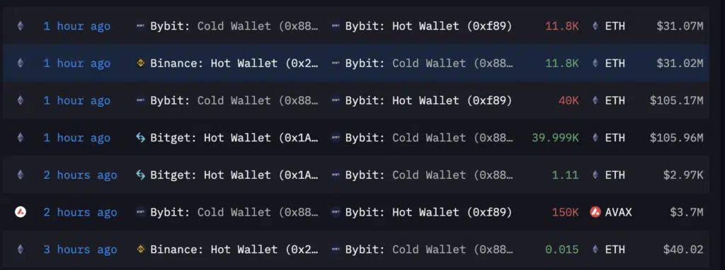 Dagli ultimi spostamenti verso uno dei cold wallet noti di Bybit sembrerebbe che a rispondere alla chiamata ci siano stati principalmente Binance e Bitget, come è visibile nello screenshot che riportiamo.