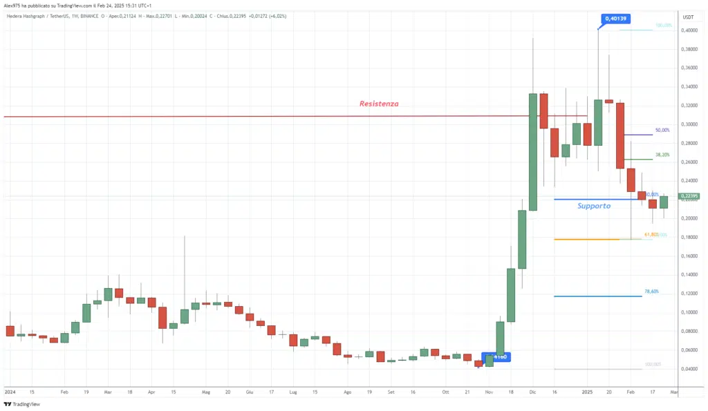 Osserviamo l’andamento del prezzo di HBAR sul grafico daily a partire dall’inizio del 2025. Con l’inizio di febbraio, sulla scia della bad news riguardante i dazi di Trump, anche il prezzo di Hedera ha subito un spike ribassista, scendendo sotto il supporto principale e toccando il livello del 0,618 di Fibonacci del vettore che va dal minimo di novembre fino al massimo di gennaio 2025.