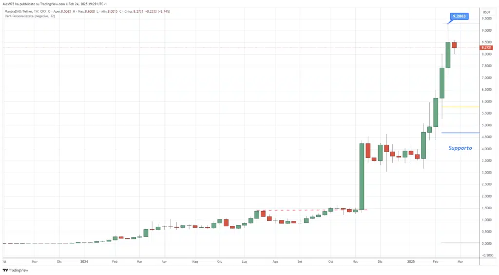 Analizzando il trend, si nota un uptrend continuo per tutto il 2024, con poche interruzioni. Ad Aprile 2024 il prezzo di Mantra ha superato per la prima volta 1 USDT. Il successivo novembre ha registrato un rally da 1,257 USDT a 3,572 USDT, con un incremento settimanale del +195%.
