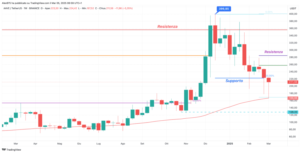 Focalizzandoci sui movimenti di breve termine, il grafico daily evidenzia la fase discendente in atto nel 2025. Il prezzo di AAVE, dal minimo registrato ieri a 167,52 USDT, sta tentando un rimbalzo. Tuttavia, questo minimo è stato toccato in una “terra di nessuno”, ovvero senza supporti tecnici o pattern grafici chiari da poter utilizzare per operazioni strategiche.