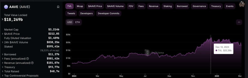 A livello di metriche on-chain, Aave rimane il secondo protocollo della DeFi (Decentralized Finance). Attualmente, vanta una TVL (Total Value Locked)di 18,269 miliardi di dollari, come evidenziato dal grafico di DefiLlama. La TVL è superiore ai livelli di inizio 2024, ma mostra una fase di calo dai picchi di dicembre 2024, quando aveva raggiunto i 22,39 miliardi di dollari.