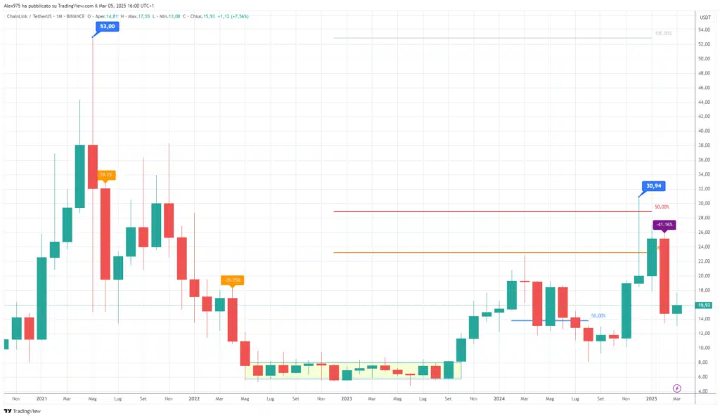 Osservando il grafico weekly di ChainLink, possiamo focalizzarci sugli ultimi mesi. Ad agosto 2024, il prezzo ha toccato un minimo di periodo a 8,08 USDT, da cui è poi partito un rimbalzo significativo, culminato con il massimo di dicembre a 30,95 USDT. Da questo livello è iniziata la correzione.