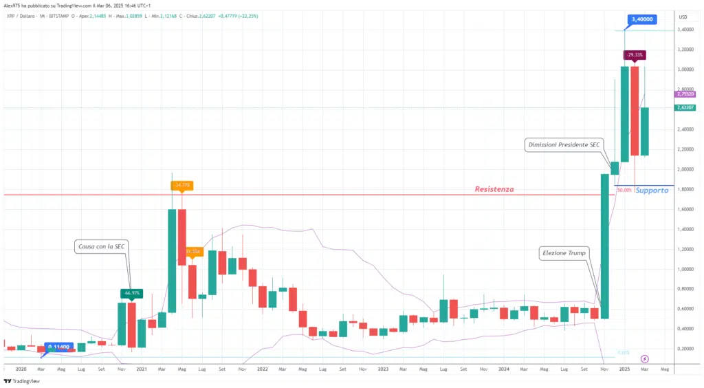 L’andamento di Ripple è particolare se si pensa alla sua storia degli ultimi anni, caratterizzata dalla causa con la SEC, che ha zavorrato il prezzo per oltre tre anni. Osservando il grafico monthly, a novembre, con l’elezione di Trump e il cambio di policy verso le crypto, il prezzo di XRP ha avuto un boom rialzista.