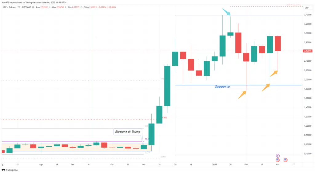 A gennaio 2025 Ripple ha raggiunto un massimo di 3,40$, da cui ha avviato una fase di ritracciamento. Il ribasso è stato violento a febbraio e il mese si è chiuso con un -29,33%, dopo aver toccato un minimo di 1,7683$. Durante la discesa, il prezzo ha toccato il supporto di lungo termine in area 1,85 USDT.