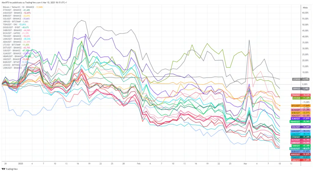 Focalizzandoci su Solana, la discesa ha riportato il prezzo sui livelli di sei mesi fa, come si può osservare nel grafico monthly. Da questa view si nota che febbraio si è chiuso con un -36%, una performance negativa simile a quella di aprile 2024 (-37,38%).