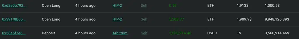 Secondo i dati di Hypurrscan, la whale avrebbe riprovato questa mattina ad andare long su Ethereum, al prezzo di $1.909, senza però ripetere gli stessi risultati di ieri. Il soggetto ha prima ri-depositato 3,56 milioni di USDC su Hyperliquid, poi ha piazzato l’ordine di acquisto su ETH, utilizzando però una leva finanziaria molto più bassa rispetto a quella esercitata in altre occasioni.