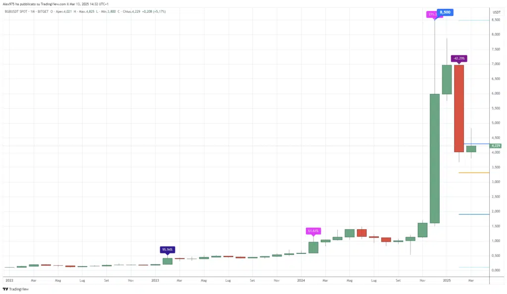 Attualmente, BGB quota 4,20 USDT e a marzo si trova in crescita del 5%. Il trend negativo del 2025 è stato influenzato dalla forte correzione di febbraio (-42%), mentre gennaio era stato positivo con un +16%, segnando il quinto mese consecutivo di rialzo.