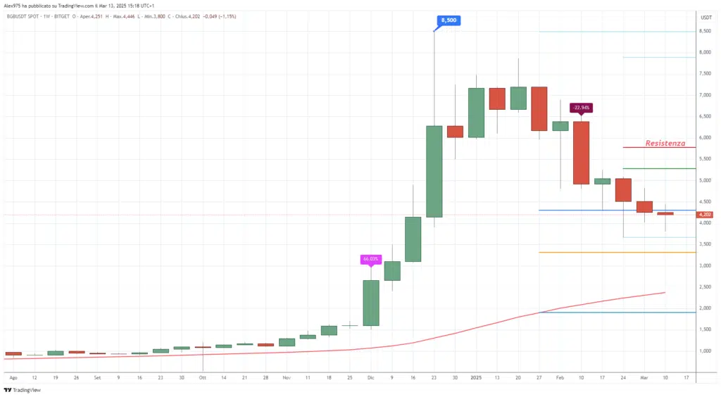 Passando ad analizzare l’andamento del prezzo di $BGB sul grafcio weekly si notano megli i dettagli del boom rializsta iniaizato da dottobre 2024. A dicembre, c’è stato il rally che ha portato il prezzo da 1,613 USDT fino al nuovo ATH di 8,50 USDT.