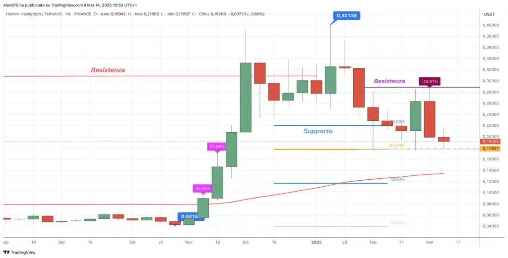 Ad inizio gennaio 2025, HBAR ha registrato il massimo degli ultimi anni a 0,40139 USDT, da dove è iniziata la fase correttiva. Nella discesa, il prezzo ha rotto anche il supporto principale indicato nell’analisi del 17 gennaio: