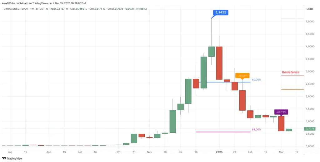 La capitalizzazione di mercato di Virtuals Protocol è di 469 milioni, in calo rispetto ai 4,5 miliardi di dollari di inizio gennaio. Oggi Virtuals si colloca alla posizione numero 109 della classifica di coin market cap. Osservando il grafico weekly, si può vedere una panoramica storica del prezzo di $VIRTURALS che, dopo una fase iniziale con movimenti contenuti, ha iniziato una forte crescita nell’ottobre 2024. Nell’arco di due settimane è passato da 0,062 USDT a 0,5105 USDT, segnando un incremento del +550%. A novembre, nell’arco di 30 giorni, c’è stato un rally di circa il +1.000%.