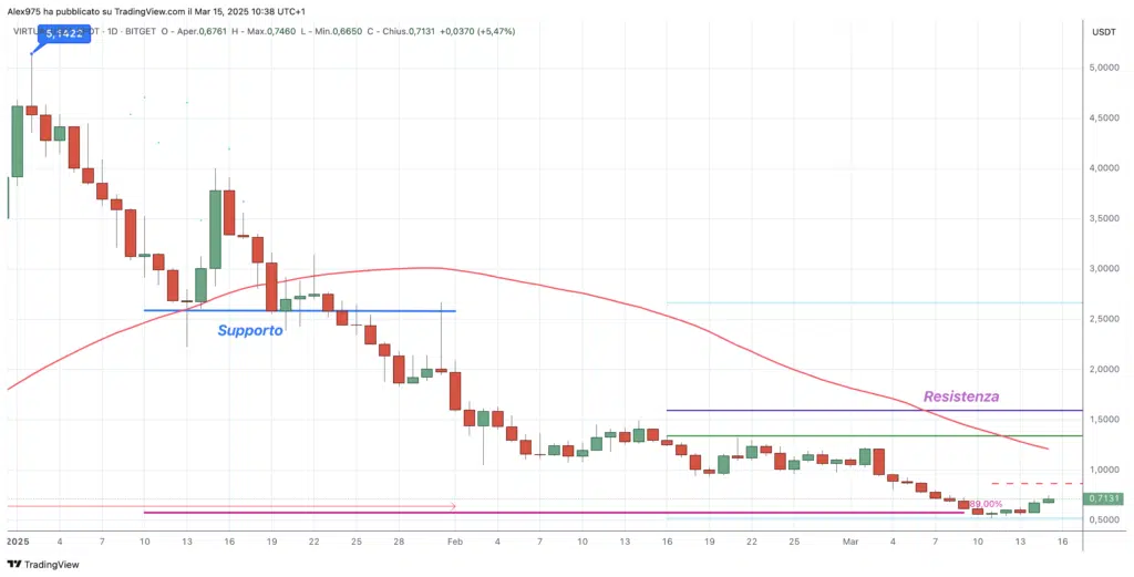 Attualmente, $VIRTUALS quota 0,7085 USDT e a marzo sta subendo un forte ribasso del 35%. Se analizziamo l’andamento da inizio anno, possiamo parlare di un vero crollo del prezzo, con un profondo rosso per Virtuals pari all’85%.