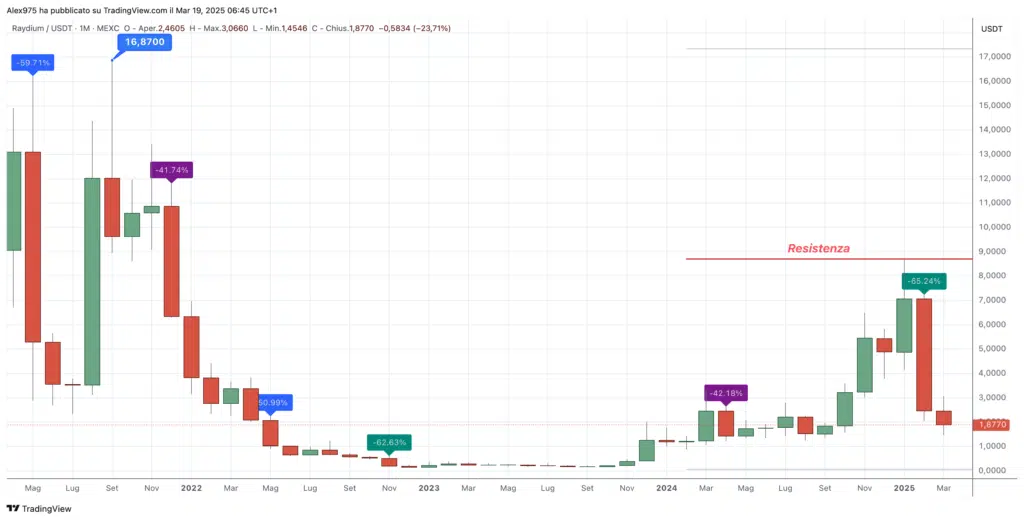 Su questa panoramica si nota la fase di accelerazione rialzista iniziata dall’estate 2024. Il rialzo ha portato a metà gennaio 2025 il prezzo di RAY a un massimo di 8,6971 USDT, da cui è poi iniziata la fase di discesa.