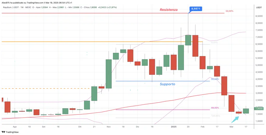 Dall’annuncio, il prezzo di RAY è in crescita del 21% da inizio settimana, come si può osservare sul grafico weekly.