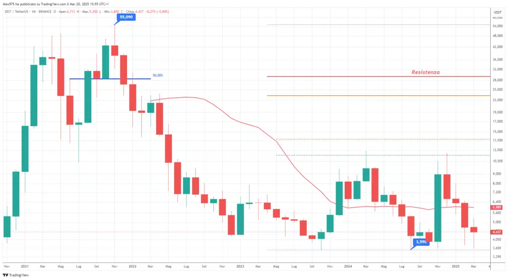Attualmente, Polkadot sta registrando il quarto mese consecutivo in ribasso. La fase di bearish trend è ormai di lungo periodo, come si può osservare dal grafico monthly allegato. Qui abbiamo una panoramica del prezzo che parte dal 2021, dove si evidenzia l’ATH registrato a 55,090 USDT a novembre dello stesso anno.
