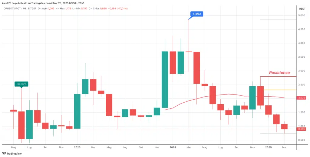 Il trend ribassista e si sta estendendo anche nel 2025 e a marzo 2025, $OP nsegna un ribasso del -17%, che potrebbe rappresentare il quarto mese consecutivo in negativo. Attualmente, su base mensile, non si configurano pattern tecnici evidenti che suggeriscano una possibile inversione del trend in corso.