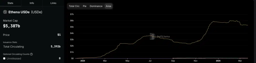 Indipendentemente dalla regolamentazione MiCa, oggi USDe ha una market cap di 5,382 miliardi di dollari e si colloca al terzo posto nel ranking globale delle stablecoin, dietro a Tether (USDT) e USD Coin (USDC). Nel grafico allegato di DefiLlama, si può osservare l’andamento della TVL (Total Value Locked) di USDe dal suo lancio a fine 2023.