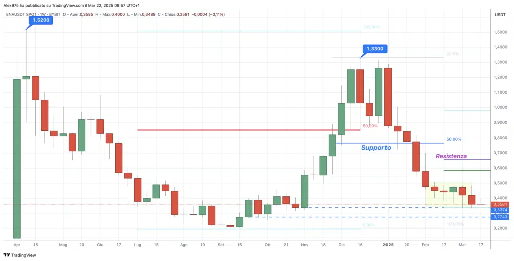Sul grafico weekly, abbiamo una panoramica del prezzo di $ENA dal suo lancio nell’aprile 2024, e il relativo ATH di 1,52 USDT raggiunto nei giorni successivi. Da qui si è avviata una fase discendente che in estate ha portato il prezzo a un minimo di 0,1940 USDT da dove c’è stato il rimbalzo culminato nel boom di novembre con un +132%.