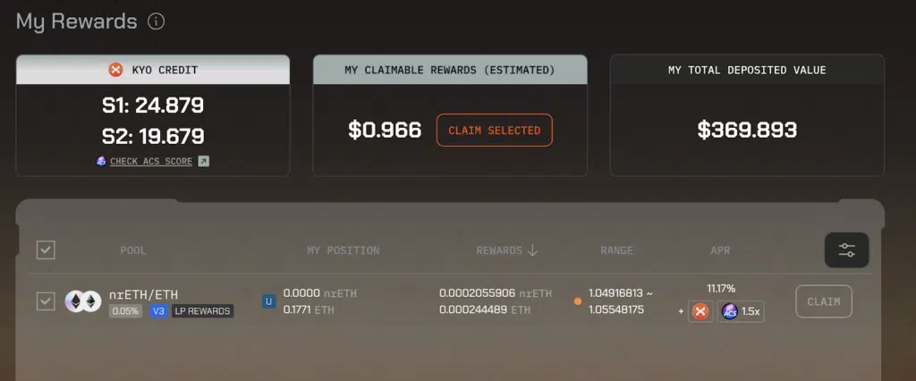 Andando più nello specifico, ci focalizziamo su quelle operazioni che potrebbero aumentare le chance di ricevere un ingente airdrop da Soneium. Oltre alle operazioni di swap su Kyo finance e su gli altri DEX come Sonex, Velodrome, Sonus e Quickswap, sarà importante fare da fornitore di liquidità LP. Potete farlo direttamente su Kyo Finance, scegliendo la pool nrETH-ETH, dove guadagnerete un APR dell’11% senza correre rischi di impermanent loss. nrETH è la versione di liquid restaking di Neemo Finance, il cui valore riprende interamente quello di ETH. Potete acquistare il token su DEX o ottenerlo direttamente sulla piattaforma Neemo.