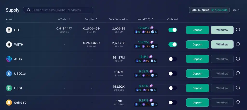 Attualmente su ETH c’è un Net APY del 10,82%, mentre su SolvBTC c’è un interessante 6,87%. Anche per le stablecoin i ritorni non sono male, visto e considerando che si ottengono anche punti airdrop che potranno essere riscattati per future reward.