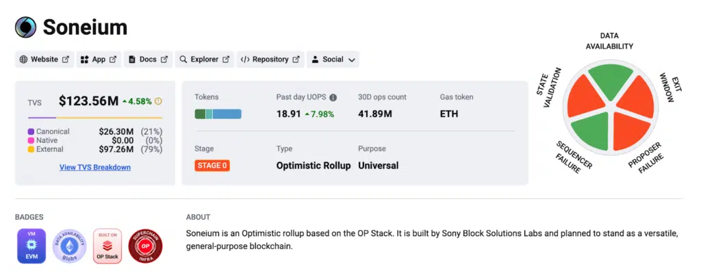 Soneium è un layer-2 optimistic rollup della blockchain Ethereum sviluppato dal team di Sony Block Solutions Labs (BSL), sussidiaria del gruppo giapponese Sony. Si tratta di una soluzione di scalabilità costruita sullo stack OP di Optimism, pensata per alleggerire il carico computazionale di Ethereum ed offrire un ambiente dedicato ai giochi web3. È stata lanciata appena il 14 gennaio 2025 ma ha già raggiunto risultati notevoli, come un TVL di 123 milioni di dollari e un numero di operazioni supportate per secondo pari a 18.9 unità.