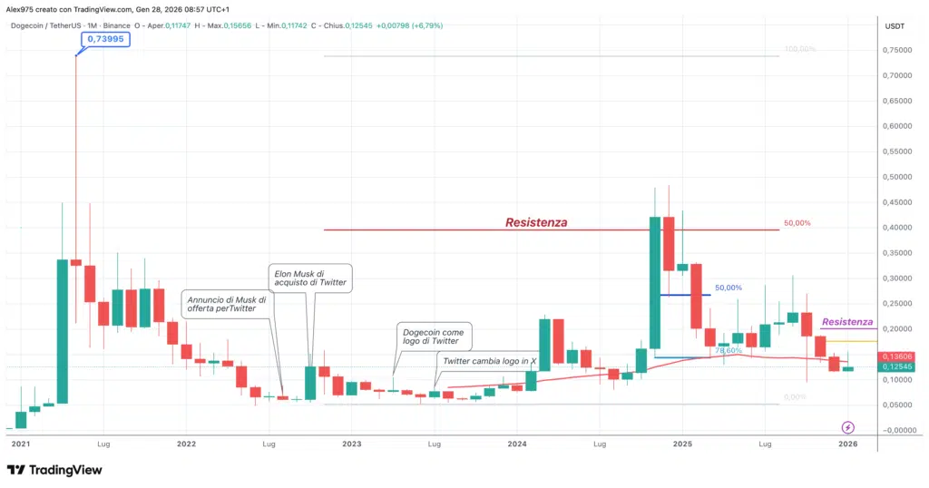 Analizzando il grafico monthly, si osserva che il prezzo di DOGE è rimasto in una fase laterale per un lungo periodo, fino al boom di inizio 2021, con una crescita esponenziale guidata dai tweet di Elon Musk e dall’entusiasmo della community che ha legato il token alla sua figura pubblica.