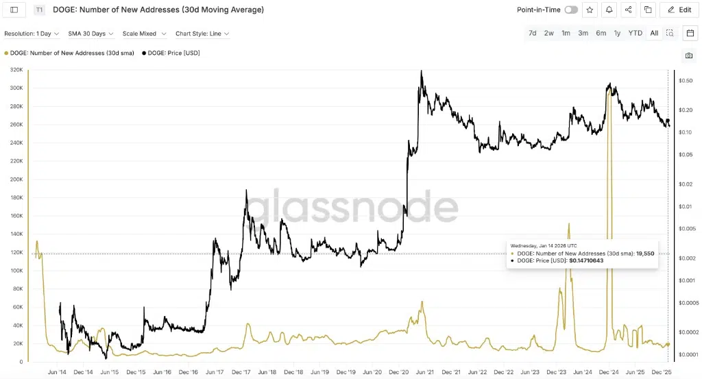 Anche l’analisi del “DOGE: Number of New Addresses” evidenzia una fase di stasi per Dogecoin. Al 28 gennaio 2026, con soli 19.550 nuovi ingressi giornalieri, la rete non mostra l’euforia necessaria per far intravedere rialzi. Questo suggerisce un momento di attesa per il retail, lontano da un’adozione di massa imminente.