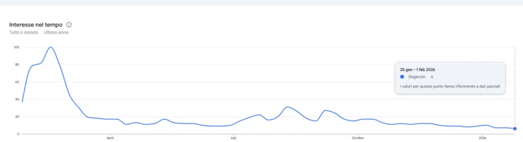 La metrica di Google Trends indica l’interesse relativo di ricerca per Dogecoin nel tempo, non volumi assoluti. Il valore è normalizzato su scala 0–100: 100 rappresenta il picco massimo di interesse nel periodo analizzato.