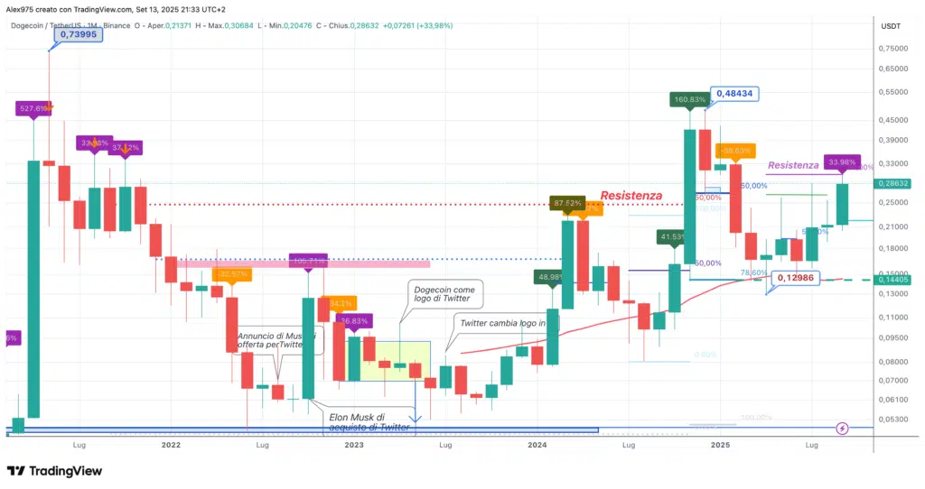 Nel 2025 il prezzo ha rotto il supporto a 0,2675 USDT, accelerando al ribasso fino al minimo di aprile a 0,12986 USDT. Successivamente, DOGE ha consolidato e tentato un breakout a luglio, rientrato. Agosto stabile, settembre +34% con test della resistenza a 0,3050 USDT.