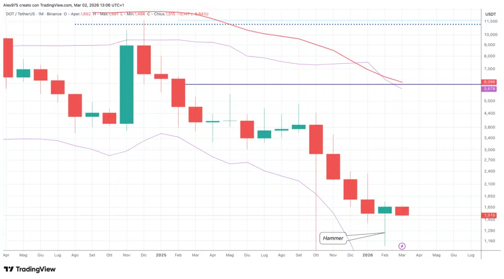 Nel 2026 DOT è in fase di contrazione ma a febbraio ha chiuso in positivo del +7,40% configurando una candela hammer, che rientra tra i possibili pattern di inversione. Tuttavia, essendo su un mensile si dovrà attendere una conferma con fine marzo.