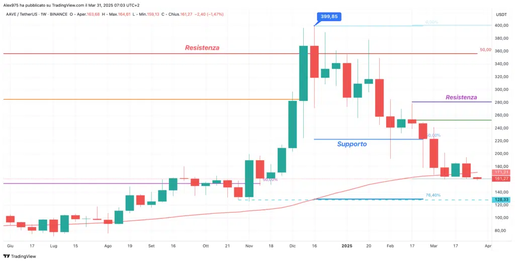 In questa panoramica ci focalizziamo sull’andamento del prezzo di AAVE dall’estate scorsa, quando aveva fatto base in area 75–80 USDT. Da quel momento è iniziata una fase di accelerazione che ha portato il prezzo a toccare un massimo a 399,85 USDT.