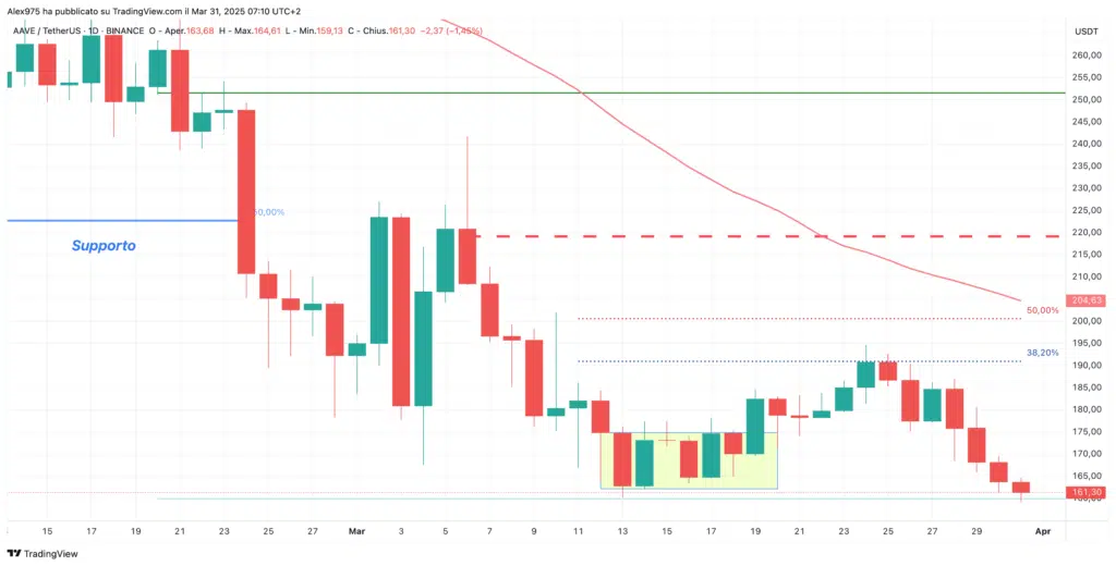 Sul grafico daily si può osservare come AAVE avesse inizialmente tentato una reazione, ma il movimento si è arrestato sulla prima resistenza a 190 USDT, senza riuscire a raggiungere l’area dei 200 USDT, che resta la resistenza principale di breve termine.