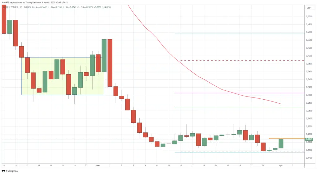 Oggi sta crescendo di un +15% e, per provare a dare una conferma del tentativo di rialzo, dovrà chiudere sopra la resistenza a 0,190 USDT. Al momento ha fatto un massimo a 0,1951 USDT e sta ritracciando.